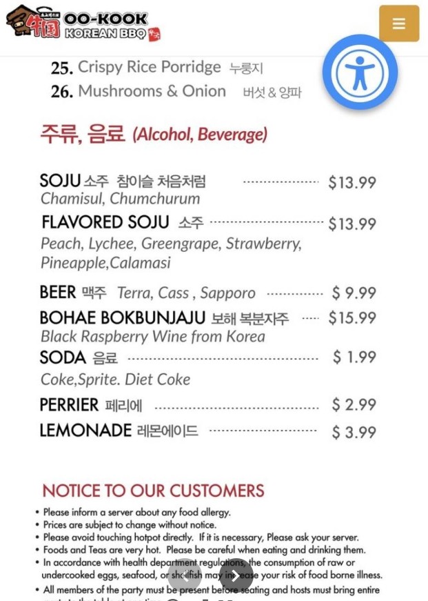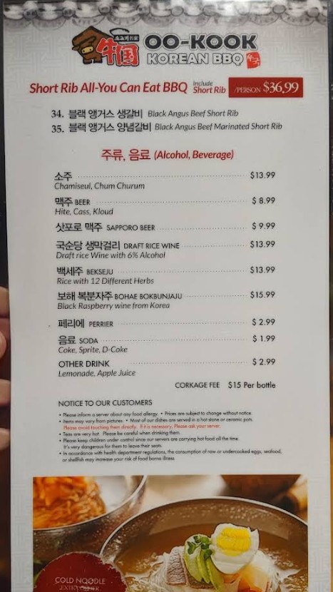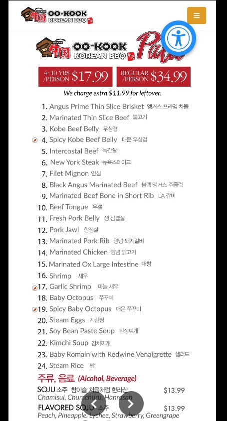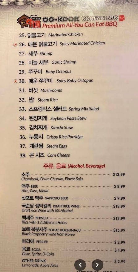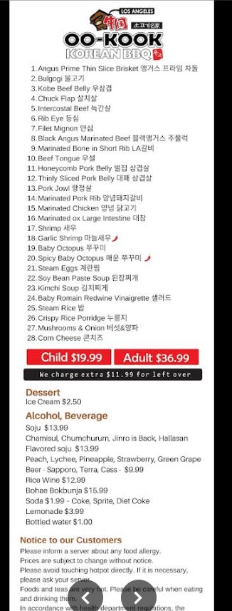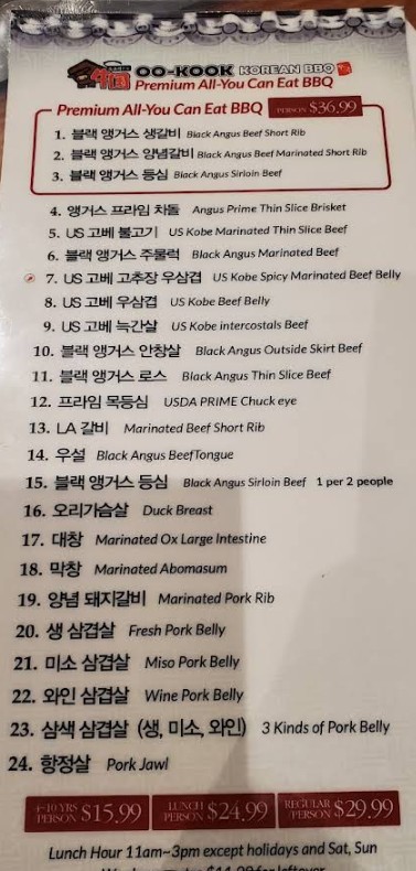 Oo Kook offers a wide variety of unlimited Korean BBQ options. On weekdays, you can enjoy their Happy Hour special from 5-7 PM at just $30 per person. However, the Happy Hour period tends to be very busy, making parking and securing a table a challenge. Even with valet parking, I had to wait a while to park, and the parking fee is $4. Considering the affordable price for unlimited options, the quality of the meat and food is excellent. Despite the busyness, the staff provided quick and attentive service. In a time of rising prices, their affordable Happy Hour makes this place worth 5 stars!